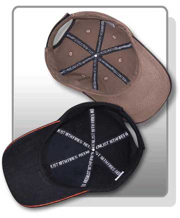 We offer a low 144-piece minimum on interior piping text. Our interior piping text is woven, not printed, therefore both the text and background can be done in any PMS matching color. This is an excellent way to further enhance your branding.